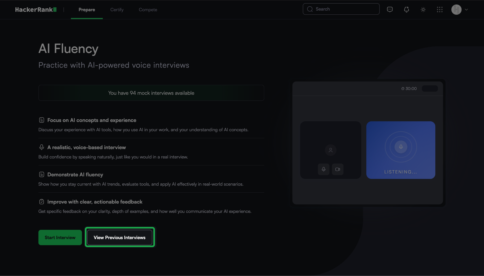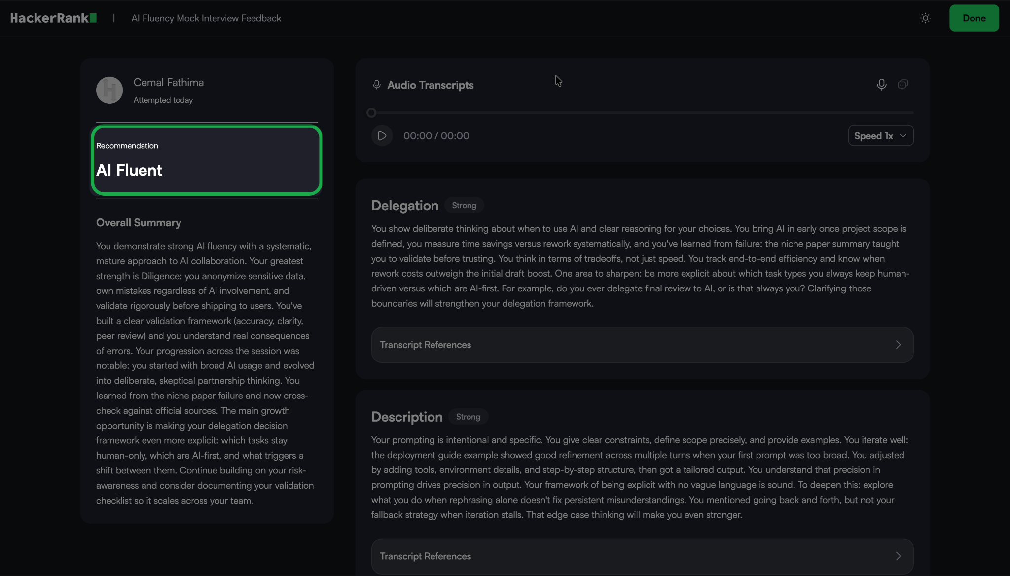The AI Fluency mock interview uses an AI-powered, voice-based interviewer to conduct fully autonomous AI fluency interviews. The interview mirrors real-world interview structure and rigor. It provides structured, unbiased feedback to help you evaluate your performance.